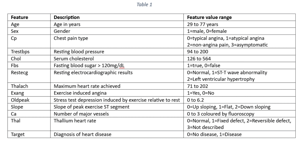 The dataset contains 133 samples for predicting the occurrence of heart disease. Each sample has 13 features that can be used to predict cardiac failure. The features include demographic details like age and sex and clinical indicators. The cardio-vascular disease indicators are: Type of chest pain, Blood pressure, Cholesterol, fasting blood sugar, resting electrocardiographic results, Maximum heart rate achieved, Exercise induced angina, Old peak, Slope, Number of major vessels coloured by fluoroscopy and Thalassemia. The target variable is the occurrence or non-occurrence of heart disease. The features are explained in Table 1.