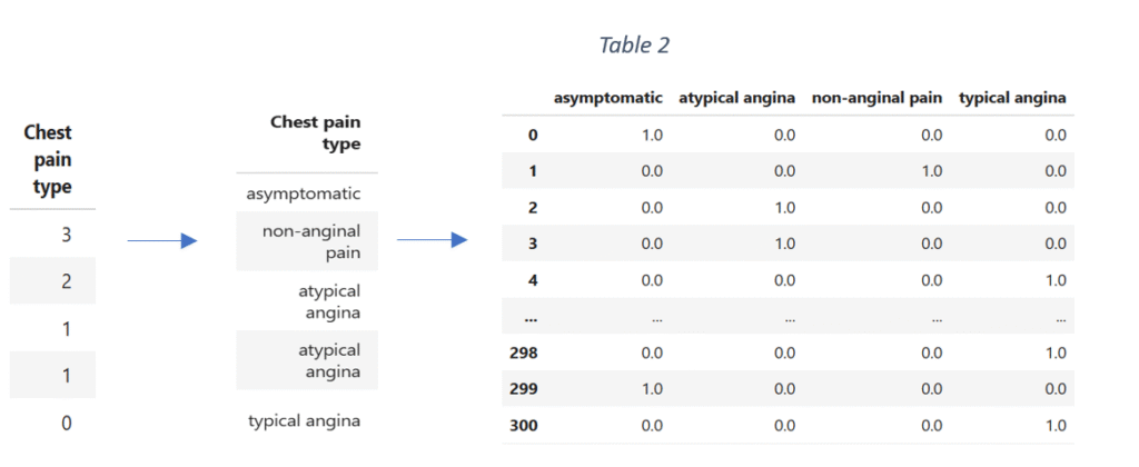 The data is then one hot encoded, converted into a data frame and concatenated with the original data. After transformation, the original column ‘Chest pain type’ is dropped. The process of data encoding is repeated for the remaining categorical variables.