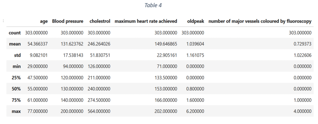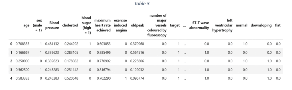 After one hot encoding, the quantitative variables are identified and scaled to a fixed range between 0 and 1. ‘Minmax scaler’ scales the data and is suitable even when the data distribution is not Gaussian. For the given data, variables like age, blood pressure, cholesterol, maximum heart rate achieved, old peak and major vessels coloured by fluoroscopy are scaled using ‘Minmax scaler’. The final dataset in shown in Table 3.