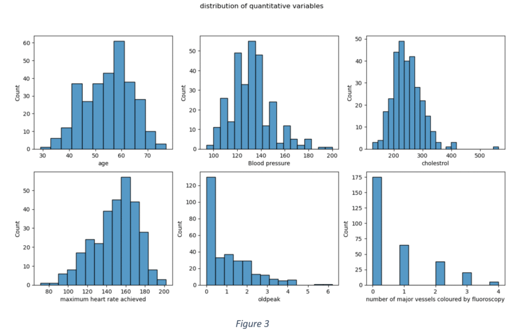 Apart from the data distribution of each quantitative variable, the correlation matrix in Figure 4 shows that nearly all the quantitative features are weakly correlated. The highest correlation is -0.43 between old peak and maximum heart rate achieved. The correlation between maximum heart rate and age is -0.43. Hence, the association of each feature with the target variable can be analysed independent of other features.
