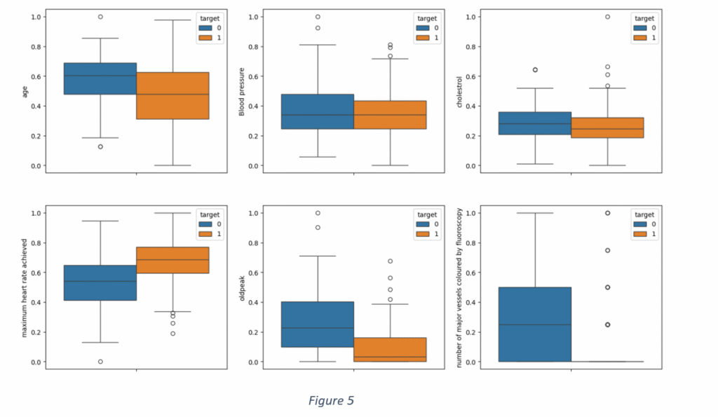 Given a weak correlation among quantitative variable, the distribution of each quantitative variable against target variable was analysed independently. It is observed from Figure 5 shows that ‘Blood pressure’ and ‘Cholesterol’ are not suitable indictors, given a large overlap between positive and negative labels of target variable. The ‘Age’ distribution shows 75% of cases of heart disease with age less than 65 and 75% of cases without heart disease falling the age group 20 to 70. Age, alone, may not be a reliable indicator.