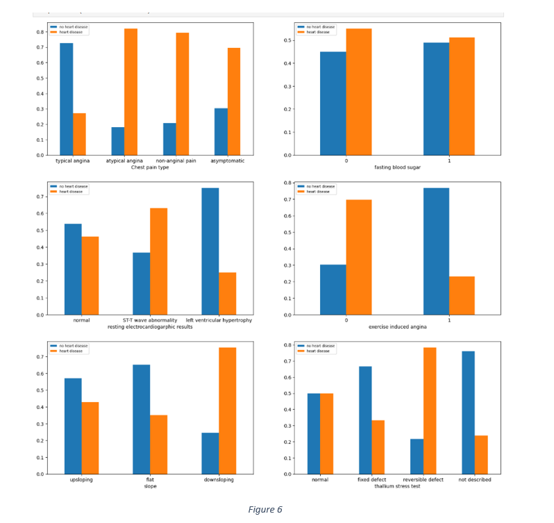 The relationship between categorical data and the target variable was gauged by observing the distribution of different categories of each categorical feature against the target, as shown in Figure 6. The chest pain distribution shows that 60% to 80% each of asymptomatic, atypical angina and non-anginal pain samples had heart disease. Similarly, most of the cases with symptoms of down sloping, reversible defect in thalassemia and the absence of exercise induced angina had no heart diseases.