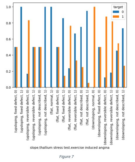 The combined impact of slope, thallium stress test and exercise induced angina in Figure 7 shows that the reversible defect in thallium heart rate is one of the dominant factors associated with occurrence of heart disease.