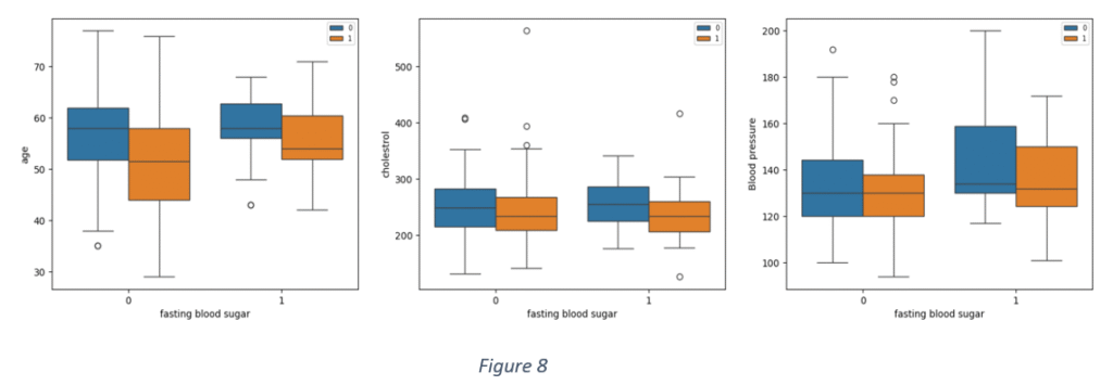Figure 8 shows distribution of some quantitative variables against ‘Blood sugar’ for positive and negative cases of heart disease. It is observed that there are overlaps between ‘Age’ and ‘Blood sugar’, ‘Age’ and ‘Cholesterol and ‘Age’ and ‘Blood pressure’ notwithstanding the prevalence of heart disease.