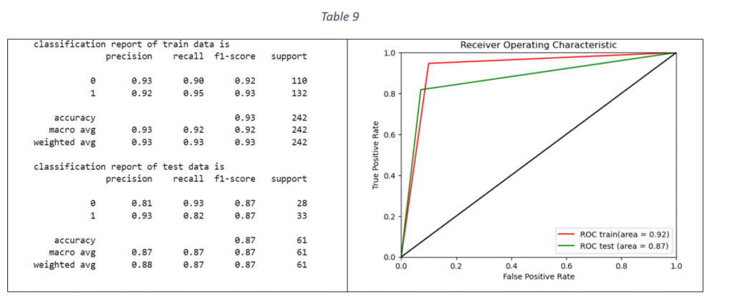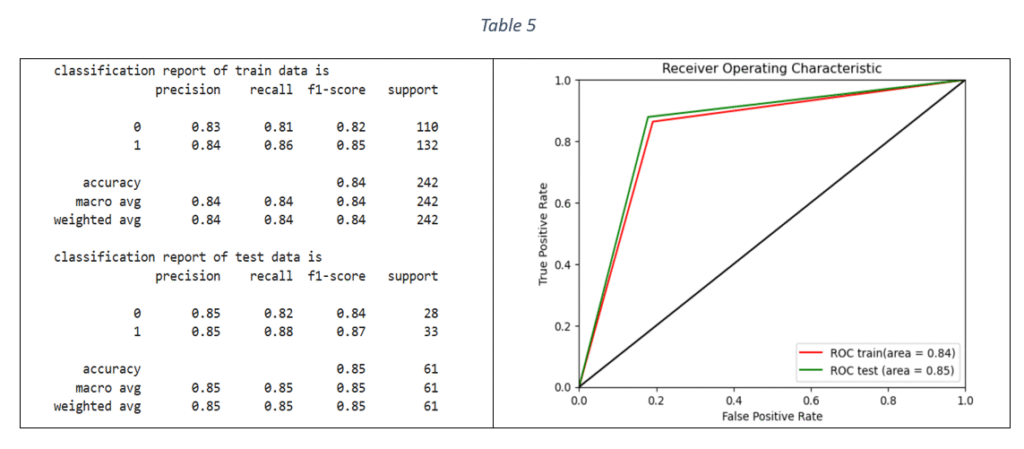 It is observed from Figure 9 that Area Under Curve (AUC) value of Random Forest Classifier is the maximum on train data. However, the performance worsens on test data, indicating the model’s ability to pick up train data patterns with higher accuracy. Decision Tree AUC is better than Logistic Regression and SVM classifiers but the performance is the worst on test data among all the models, proving that the tree structure can get altered for any new data. The Decision Tree exhibits the problem of overfitting, as it becomes unstable with slight variations in data. The variations are acute with high dimensional data. The classifier’s performance improves for large sample sizes, fewer features and balanced distribution of classes in categorical data. In the given case, the dataset had only 133 samples and large number of features.