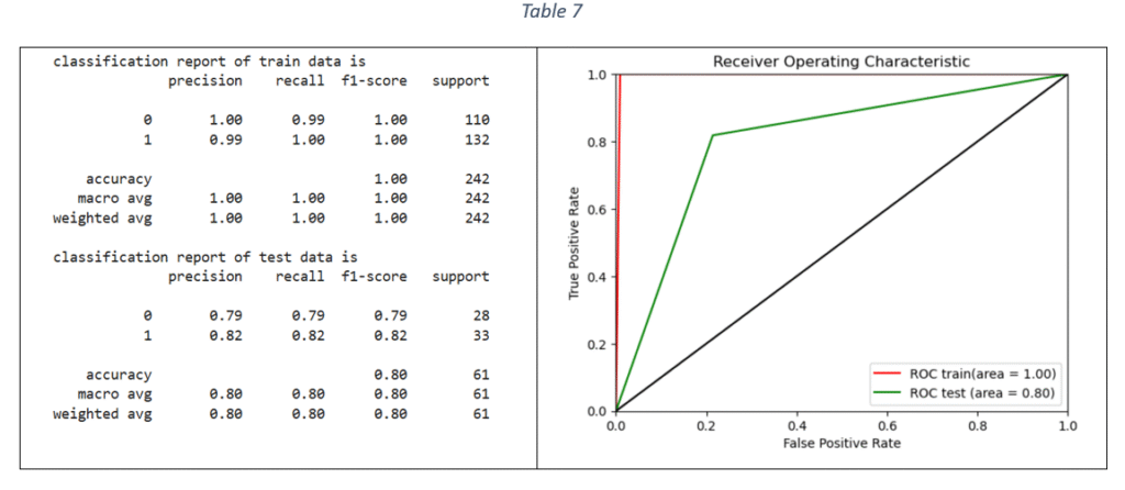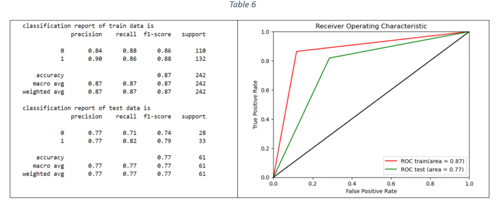 Decision Tree (DT) classifier: Decision tree classifier is suitable for binary classification. The decision tree is used to predict the target value by splitting the data based on one feature at a time. The classifier parameters for hyper-parameter tuning are criterion, maximum depth, minimum number of samples required to split an internal node, maximum number of features to consider for the best split, minimum number of samples per leaf node and class weight. Based on F1 score, the best parameters are selected for training the DT model on train data. The classification report and ROC-AUC are shown in Table 6.