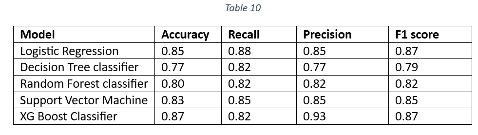 Table 10 is a comparison of accuracy, recall, precision and F1 score of all the models on test data.