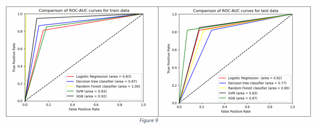 The Accuracy, Precision and F1 values of XG Boost Classifier are the highest. The higher Accuracy and F1 values of XG Boost Classifier make it a suitable candidate for the final model selection. The Decision tree classifier is the worst performer, suggesting that DT classifier cannot be selected as the final model. Figure 9 shows the Area Under the Curve (AUC) curve of all the models. The comparison of AUC curves is done separately for train and test data.